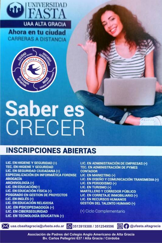 La Universidad de Fasta cuenta con una nueva sede en nuestro colegio, para mayor información comunicarse al Email: uaa.cbaaltagracia@ufasta.edu.ar – o a los teléfonos 3513919308 / 3512549596
