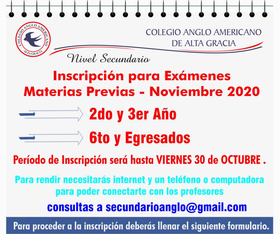 Formulario de Inscripción para las próximas instancias de exámenes para los alumnos que están cursando 4to y 5to año o lo cursaron, que adeudan materias. El Período de Inscripción será entre los días MARTES 22 y MIÉRCOLES 30 de SEPTIEMBRE . Para proceder a la inscripción deberás llenar el siguiente formulario.